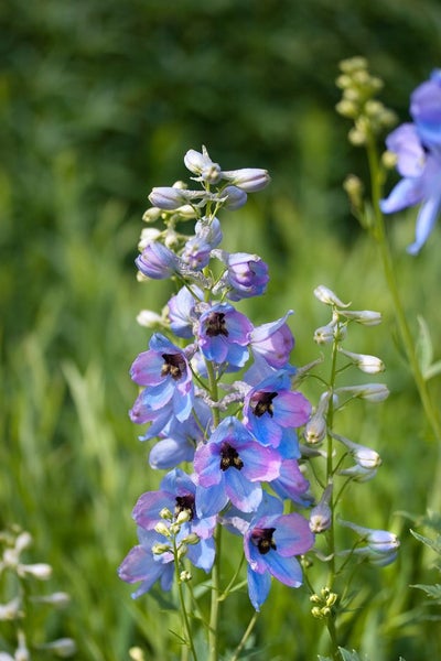 Delphinium x elatum ‘Morgentau’, der elegante Rittersporn, überzeugt als klassische Prachtstaude mit eindrucksvollen, hohen Blütenkerzen in zartem Himmelblau und einem feinen, oft helleren Auge. Von Juni bis Juli schmückt dieser Blütenstar das Staudenbeet mit üppigen Blütenrispen, bei zeitigem Rückschnitt folgt häufig eine zweite, etwas spätere Blüte. Das handförmig gelappte, frischgrüne Laub bildet einen kompakten, horstigen Gartenstauden-Busch, aus dem die aufrechten Stiele kraftvoll emporwachsen und dem Beet eine vertikale, architektonische Note verleihen.