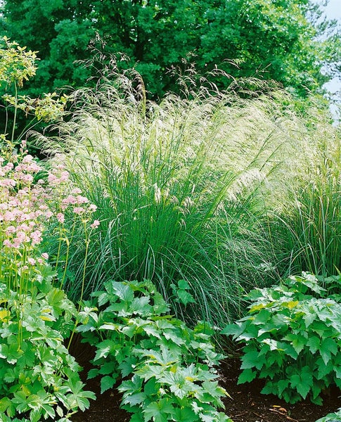 Deschampsia cespitosa ‘Bronzeschleier’, die Rasen-Schmiele, ist ein elegantes Ziergras und langlebige Gartenstaude, die mit schillernden, bronzefarbenen Rispen einen leichten, schwebenden Schleier über Beete und Rabatten legt. Das horstbildende Gras zeigt feines, sattgrünes Laub, das den filigranen Blütenständen einen harmonischen Hintergrund bietet. Ab Frühsommer bis in den Spätsommer erscheinen unzählige, luftige Blütenrispen, die je nach Lichteinfall von Gold über Kupfer bis Bronze schimmern und im Herbst dekorativ verbleiben. Mit ihrer aufrechten, dabei lockeren Wuchsform eignet sich die Sorte als strukturgebende Solitärpflanze ebenso wie für die Gruppenpflanzung im Staudenbeet, Präriegarten oder am Gehölzrand; auch im Vorgarten und als Kübelpflanze auf Terrasse und Balkon setzt sie leichte, natürliche Akzente. ‘Bronzeschleier’ bevorzugt einen sonnigen bis halbschattigen Standort mit frischem, humusreichem, durchlässigem Boden, der nicht austrocknet, zugleich aber Staunässe meidet. In normaler Gartenerde wächst sie zuverlässig, zeigt in voller Sonne die intensivste Färbung und verträgt leichten Halbschatten ohne an Eleganz zu verlieren. Pflegeleicht und standfest benötigt das Ziergras nur einen Rückschnitt der vertrockneten Halme im späten Winter, damit der neue Austrieb ungehindert starten kann; eine sparsame Frühjahrsdüngung genügt. In Kombination mit Stauden wie Echinacea, Salvia, Achillea oder Rudbeckia entstehen kontrastreiche, dauerhafte Pflanzbilder, während die feinen Rispen auch im Winter mit Reif eine stimmungsvolle Struktur liefern. Dieses vielseitige Ziergras bereichert jeden Gartenstrauch- und Staudenrahmen mit Leichtigkeit und zeitloser Anmut.