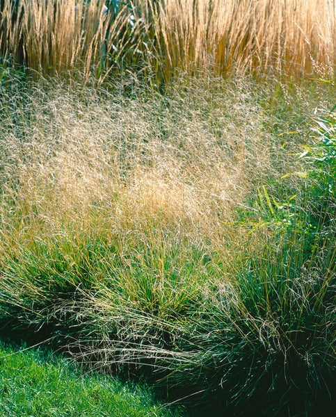 Deschampsia cespitosa ‘Schottland’, die Wald-Schmiele bzw. Rasenschmiele, ist ein edles Ziergras und langlebige Gartenstaude, die mit feinen, schwebenden Rispen bezaubert. Das Horstgras bildet dichte, aufrechte Büschel aus frischgrünem, schmalem Laub, über dem sich ab Frühsommer zarte, silbrig schimmernde Blütenrispen erheben, die im Verlauf in warme strohgoldene Töne übergehen und bis in den Winter hinein strukturstark wirken. Der Wuchs ist elegant und locker, in der Blüte erreicht die Sorte je nach Standort etwa mittlere Höhe und bringt eine leichte, nebelartige Textur ins Beet. Ideal passt diese Schmiele in Staudenbeete, Rabatten und naturhafte Pflanzungen, als Solitär zur Akzentsetzung oder in stimmungsvollen Gruppenpflanzungen im Vorgarten. Auch als Kübelpflanze auf Terrasse und Balkon überzeugt sie als filigranes Strukturgras, ebenso am Gehölzrand oder in der Nähe von Wasserelementen, wo frische bis feuchte Bedingungen gegeben sind. Bevorzugt werden halbschattige bis sonnige Lagen mit humosem, durchlässigem, gleichmäßig frischem Boden; kurzzeitige Trockenheit wird toleriert, dauerhaft austrocknende Substrate sollten vermieden werden. Eine zurückhaltende Nährstoffversorgung fördert den stabilen, standfesten Wuchs; ein Rückschnitt der alten Halme erst spät im Winter oder zeitigen Frühjahr erhält den winterlichen Zieraspekt. Teilung älterer Horste alle paar Jahre hält die Pflanze vital und sorgt für dichte, schöne Polster. Mit ihrer anmutigen Bewegung im Wind und dem langen Blütenschleier setzt Deschampsia cespitosa ‘Schottland’ im Gräserbeet, im Präriegarten und in Kombination mit filigranen Blütenstauden zeitlos-elegante Akzente.