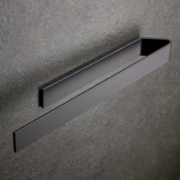 Sein gradliniges Design und die elegante Biegung machen ihn zum Hingucker in jedem Badezimmer. Die sanft abgerundeten Kanten sind Zeichen der hochwertigen Verarbeitung. Durch die Benutzung von gewalztem Aluminium haben wir die Halterung gleichzeitig belastbar und rostfrei gemacht. Zur Montage verwenden wir einen Klebestreifen der Marke 3M, der eine Bohrmaschine überflüssig macht und vor geplatzten Fliesen schützt.