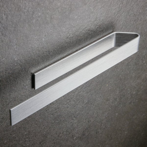 Sein gradliniges Design und die elegante Biegung machen ihn zum Hingucker in jedem Badezimmer. Die sanft abgerundeten Kanten sind Zeichen der hochwertigen Verarbeitung. Durch die Benutzung von gewalztem Aluminium haben wir die Halterung gleichzeitig belastbar und rostfrei gemacht. Zur Montage verwenden wir einen Klebestreifen der Marke 3M, der eine Bohrmaschine überflüssig macht und vor geplatzten Fliesen schützt.