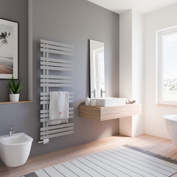 Mit seinen klaren Linien und der edlen, Pulverbeschichtung fügt sich der Heizkörper harmonisch in zeitgemäße Wohn- und Badkonzepte ein. Die vertikale Ausrichtung spart Platz und wirkt dabei stilvoll dezent.