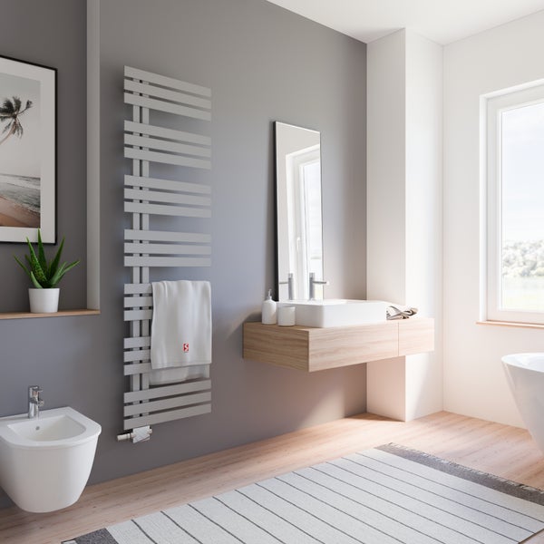 Der Heizkörper besteht aus hochwertigem Stahl und ist durch die pulverbeschichtete Oberfläche besonders langlebig, pflegeleicht und widerstandsfähig gegenüber Feuchtigkeit – perfekt für den Einsatz im Bad.