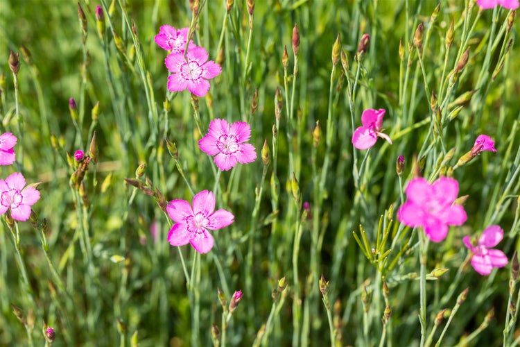 Dianthus deltoides ‘Roseus’, die zarte Heidenelke, ist eine charmante Polsterstaude, die mit einem Teppich aus unzähligen rosa bis zart pinken Blüten begeistert. Ihr botanischer Ursprung als genügsame Steingartenstaude zeigt sich in der kompakten, teppichbildenden Wuchsform und dem feinen, grasartigen, dunkelgrünen Laub, das einen attraktiven Kontrast zu den lebhaften Blüten bildet. Von späten Frühlingstagen bis in den Sommer hinein, meist von Mai bis Juli, oft mit einer leichten Nachblüte, legt diese Gartenstaude ein gleichmäßiges Blütenpolster an, das Beetränder, Fugen und Kiesflächen elegant schmückt. Als niedriger Bodendecker eignet sich die Heidenelke hervorragend für den Steingarten, den Vorgarten, den Beetrand und als Einfassung; ebenso wirkt sie in Schalen, Balkonkasten und flachen Kübeln als dekorative Kübelpflanze. In Gruppenpflanzung entstehen harmonische Flächen, während einzelne Polster im Vordergrund von Staudenbeeten punktuell Akzente setzen. Ein sonniger Standort ist ideal, der Boden sollte gut durchlässig, eher mager bis sandig-kiesig und frei von Staunässe sein; leicht kalkhaltige Substrate werden gut vertragen. Pflegeleicht in der Haltung, freut sich Dianthus deltoides ‘Roseus’ über einen leichten Rückschnitt nach der Hauptblüte, der zu kompakterem Wuchs und frischer Nachblüte anregt, sowie über sparsame Düngung, die die Blühfreude erhält, ohne die Polster zu vergeilen. Robust und winterhart bleibt das feine Laub oft wintergrün und sorgt damit auch außerhalb der Blütezeit für eine gepflegte, ordnende Struktur im Beet und im Steingarten.