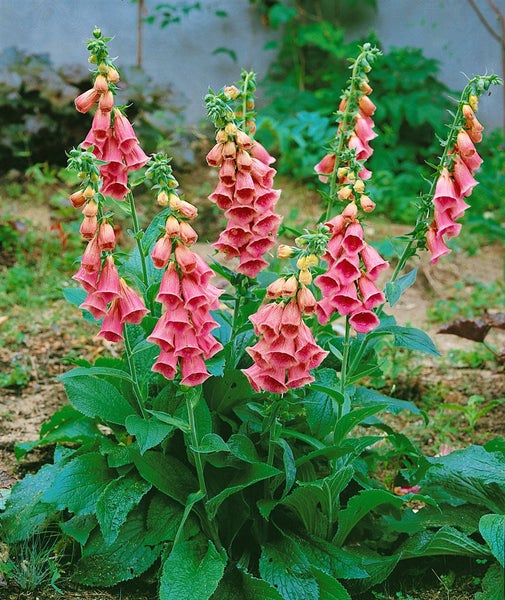 Digitalis x mertonensis, der Merton-Fingerhut, verbindet den Charme klassischer Cottage-Gärten mit der Robustheit einer langlebigen Gartenstaude. Die aufrechten Blütenähren tragen große, glockenförmige Blüten in warmen Rosé- bis kupferpurpurnen Tönen, oft edel geadert und im Schlund fein gepunktet. Von späten Frühlingstagen bis in den Hochsommer setzt der Blütenstrauch-ähnliche Wuchs markante Akzente über einer bodennahen, sattgrünen Blattrosette mit leicht samtigem Laub. Als aufrechte Blütenstaude erreicht der Fingerhut je nach Standort 80 bis 120 cm Höhe und wirkt sowohl als Solitär im Staudenbeet wie auch in Gruppenpflanzung am Gehölzrand, in der Rabatte oder im romantischen Vorgarten. Auch im großen Kübel auf Terrasse und Balkon entfaltet diese Zierpflanze ihre elegante Präsenz und eignet sich, sorgfältig arrangiert, sogar als besondere Schnittblume.