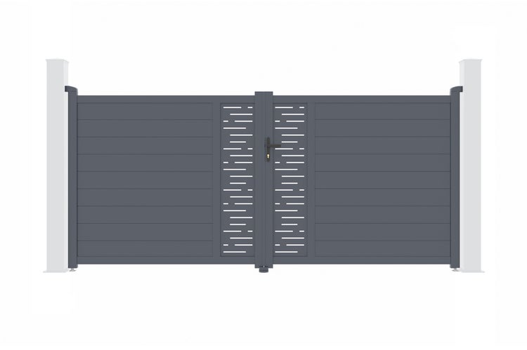 Entdecken Sie unser Aluminium-Flügeltor ARLBERG, die perfekte Balance zwischen Stil und Funktionalität dank seiner dekorativen Platten mit dem Motiv Grafische Linien.