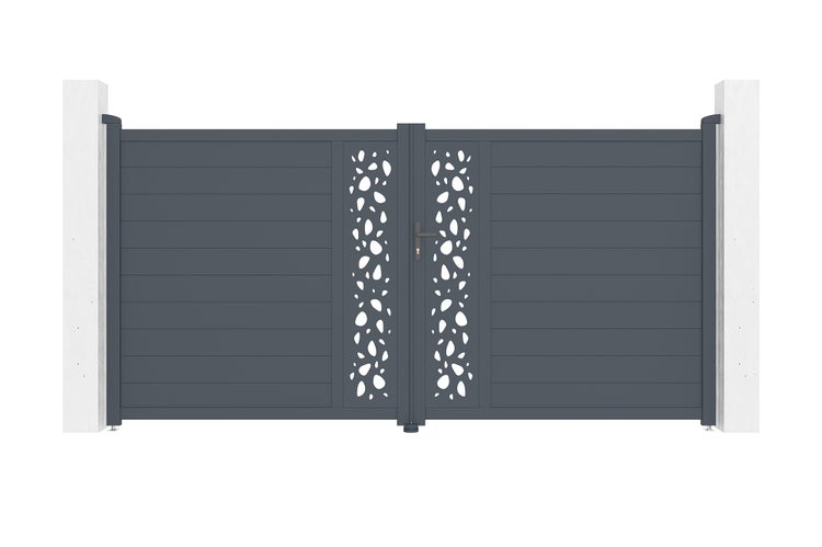 Entdecken Sie unser Doppelflügeltor SUNNY, ein echtes Statement für Stil und Raffinesse dank seiner dekorativen Platten mit Kieselstein-Muster, die an die Ruhe eines Zen-Gartens erinnern.