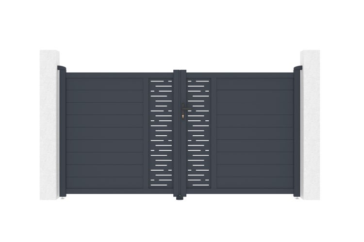 Entdecken Sie unser Aluminium-Flügeltor ARLBERG, die perfekte Balance zwischen Stil und Funktionalität dank seiner dekorativen Platten mit dem Motiv Grafische Linien.