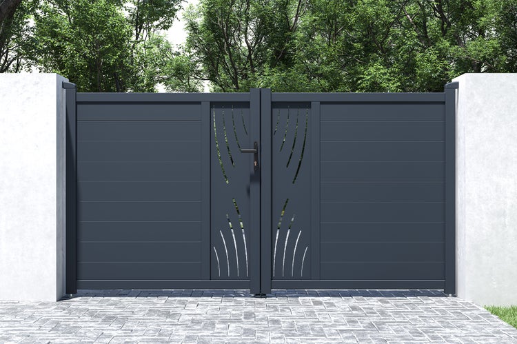 Entdecken Sie die unvergleichliche Eleganz unseres Aluminium-Flügeltores VELETA mit seinen dekorativen Platten im Natur-Stil.