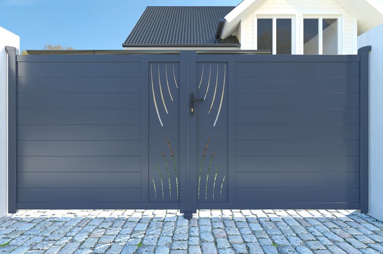 Entdecken Sie die unvergleichliche Eleganz unseres Aluminium-Flügeltores VELETA mit seinen dekorativen Platten im Natur-Stil.