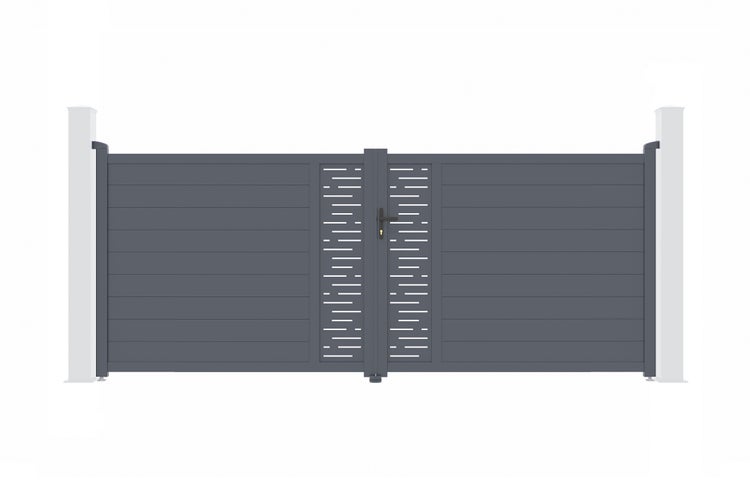 Entdecken Sie unser Aluminium-Flügeltor ARLBERG, die perfekte Balance zwischen Stil und Funktionalität dank seiner dekorativen Platten mit dem Motiv Grafische Linien.