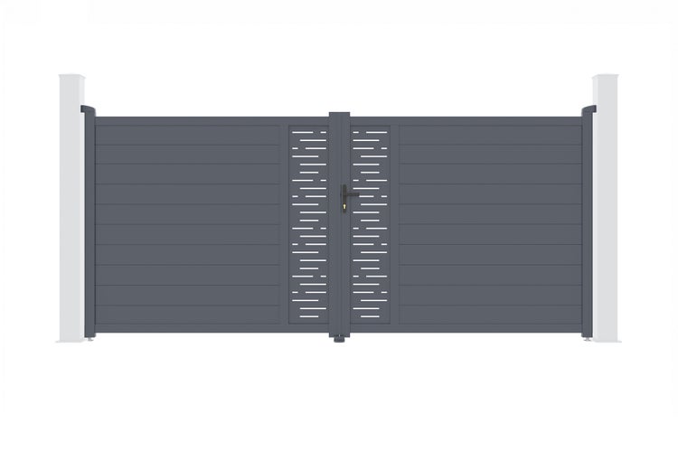 Entdecken Sie unser Aluminium-Flügeltor ARLBERG, die perfekte Balance zwischen Stil und Funktionalität dank seiner dekorativen Platten mit dem Motiv Grafische Linien.