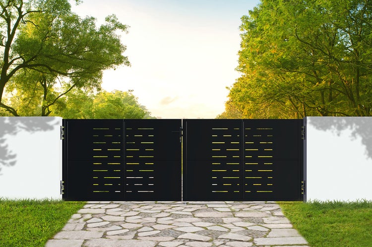 Entdecken Sie unser Design-Doppelflügeltor aus Stahl NALI ARLBERG, das mit seinen dekorativen Platten mit dem Motiv „Grafische Linien“ ein echtes Stil- stück darstellt und Ihnen gleichzeitig Sicherheit und Robustheit verspricht.