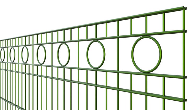Günstiger Schmuckzaun mit Kreis aus 6/5/6 Stahldraht. Alle Doppelstabmatten sind verzinkt und im Kreuzverbund punktgeschweißt sowie zusätzlich in RAL 6005 Moosgrün pulverbeschichtet! Einseitiger Mattenüberstand mit Drahtspitzen. Auf einer Zaunmattenseite ca. 28mm überstehend.
