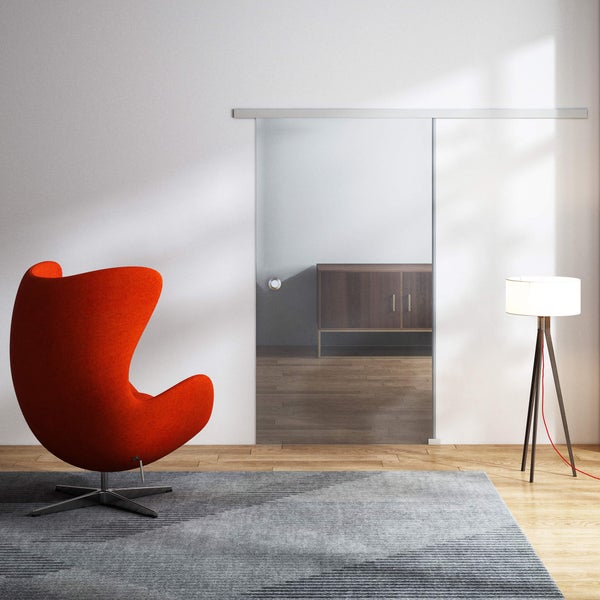 Im Set enthalten ist das Dorma Muto M 60 Schiebetürsystem mit einer 1900 mm langen Laufschiene in Silber. Sie ist kürzbar und sorgt dank kugelgelagerter Laufwagen für ruhiges, kontrolliertes Gleiten.