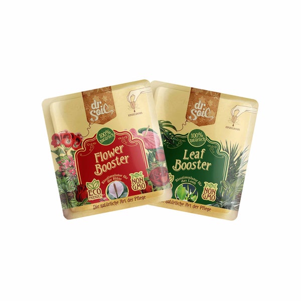 Dr.Soil Pflanzenpflegepaket für die Gesundheit von blühenden Pflanzen mit konzentrierten Monodosen von Leaf Booster 10ml (Biostimulator für die Blattregeneration) und Flower Booster 10ml (Biostimulator für die Blüte)
