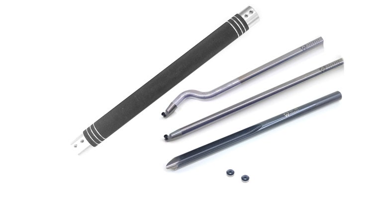 Set best. aus 2 Stück Ø12mm HSS-Schneideplatte 16er gerader und gekröpfter ausziehbare Halterstange (Länge je 350mm), Ø 16mm HSS-Schüsselröhre, Aluminiumheft Länge 400mm mit den Aufnahmebohrungen Ø 13mm / 16mm.