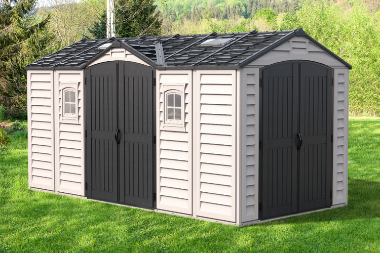 Das Duramax Kunststoff-Gerätehaus beinhaltet einen Bodenrahmen, zwei große Türen mit doppelter Öffnung und Türgriffen mit Ösen für Vorhängeschlösser. Die Wandsäulen sind aus Metall verstärkt und verleihen Stabilität. Für eine lange Haltbarkeit wurde eines der härtesten und wetterbeständigsten Vinylharze verwendet.