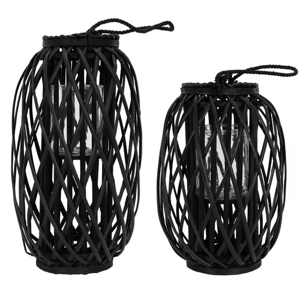 ECD Germany 2er Set Laterne Ried 40xØ26cm/50xØ28cm mit Henkel, Schwarz, Seilfaser, Flechtoptik Rattan Windlicht mit Glaseinsatz, Retro-Laterne, Handgeflochtene Gartenlaterne Kerzenhalter Kerzenständer