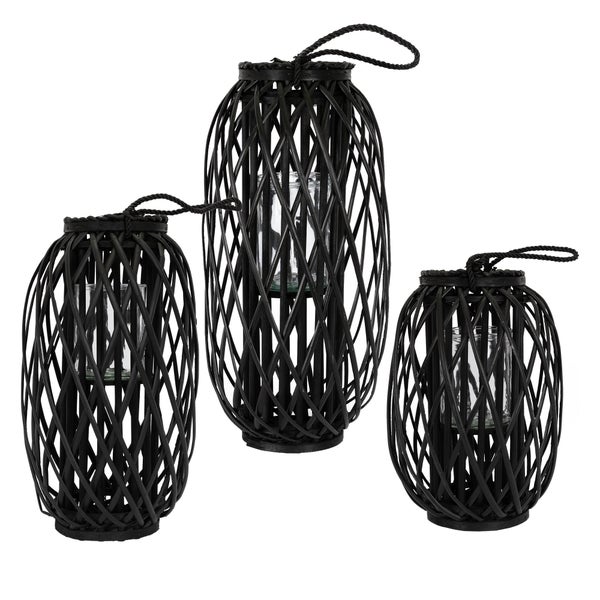 ECD Germany 3er Set Laterne Ried 40xØ26cm/50xØ28cm/60xØ27 cm mit Henkel, Schwarz Holz, Flechtoptik Rattan Windlicht Glaseinsatz, Retro-Laterne, Handgeflochtene Gartenlaterne Kerzenhalter Kerzenständer