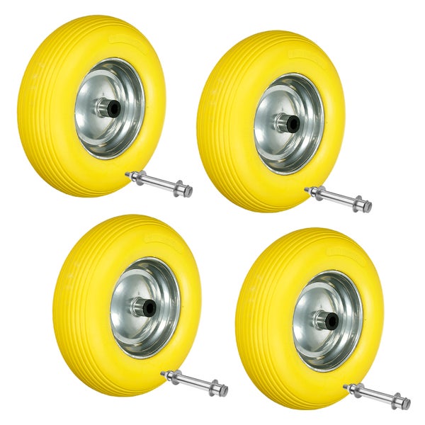 ECD Germany 4er Set Schubkarrenrad aus pannensicherem PU Vollgummi, Ersatzrad Gummirad mit Achse, 4.80/4.00-8, Durchmesser 390mm, Gelb, 200kg, Reifen mit Stahlfelge, Reifen für Schubkarre Gartenkarren