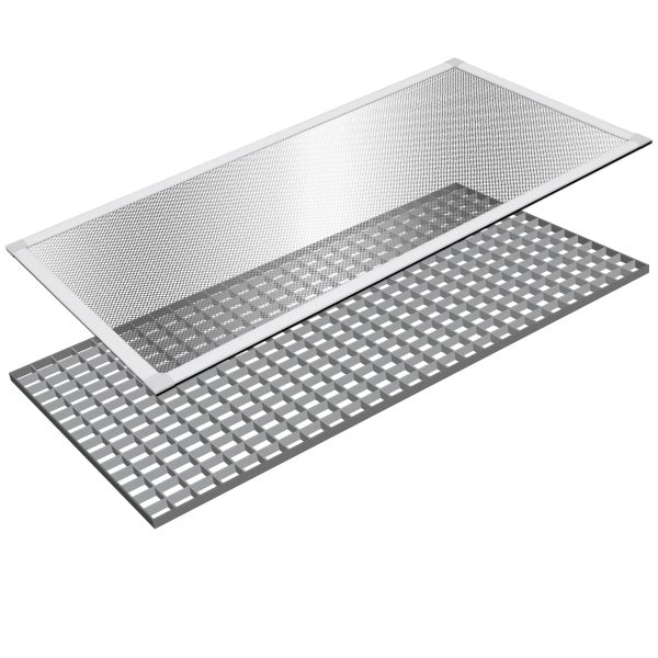 Die Abdeckung besteht aus einem Aluminiumnetz in einem Aluminiumrahmen mit Kunststoff-Eckverbindern. Durch diese Konstruktion können Sie die Lichtschachtabdeckung ganz leicht und ohne komplizierte Gehrungsschnitteauch auf Ihr individuelles Lichtschacht-Maß anpassen. Die Abdeckung ist zusätzlich mit einer umlaufenden Bürstendichtung ausgestattet, die problemlos Bodenunebenheiten ausgleicht.