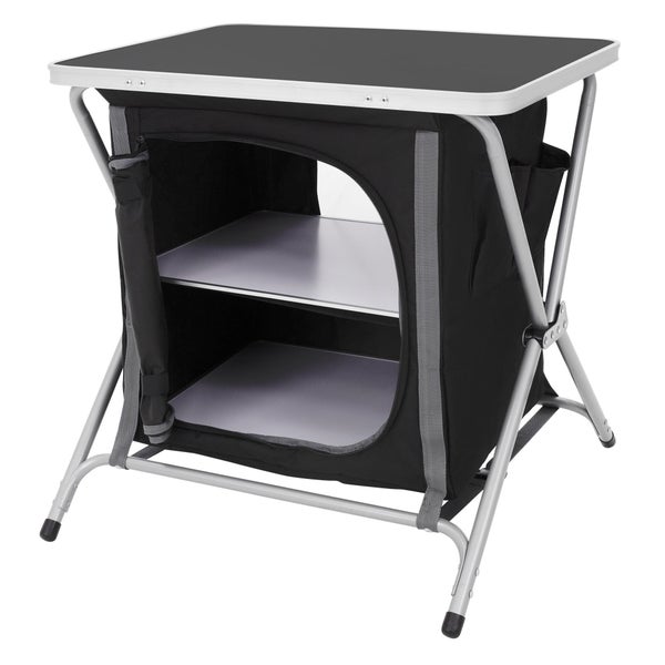 Das hochwertige und klappbare Küchenregal mit den vielen Ablageböden bietet ausreichend Stauraum für einen komfortablen Camping- Aufenthalt. Das Regal aus Aluminium-Rohren lässt sich besonders platzsparend klappen und somit gut verstauen. Die obere Ablage besteht aus PVC und hat einer abwischbaren Beschichtung. Die weiteren 2 Ablageböden befinden sich in einem geschützten Schrank aus Polyester mit Netzgewebe auf der Rückseite für eine gute Belüftung. Der Schrank lässt sich bequem per Reißverschluss verschließen und die 'Tür' lässt sich bei Bedarf einfach zur Seite einrollen und fixieren. Das hochwertige Regal bzw. der Schrank bietet ausreichend Stauraum für einen längeren Camping Aufenthalt.