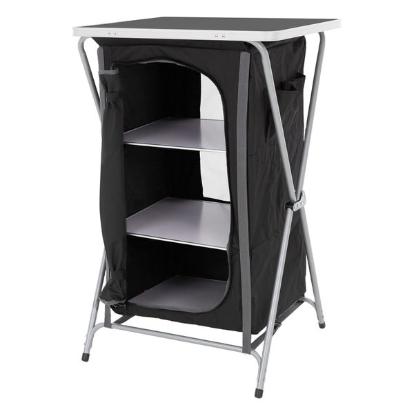 Das hochwertige und klappbare Küchenregal mit den vielen Ablageböden bietet ausreichend Stauraum für einen komfortablen Camping- Aufenthalt. Das Regal aus Aluminium-Rohren lässt sich besonders platzsparend klappen und somit gut verstauen. Die obere Ablage besteht aus PVC und hat einer abwischbaren Beschichtung. Die weiteren 3 Ablageböden befinden sich in einem geschützten Schrank aus Polyester mit Netzgewebe auf der Rückseite für eine gute Belüftung. Der Schrank lässt sich bequem per Reißverschluss verschließen und die 'Tür' lässt sich bei Bedarf einfach zur Seite einrollen und fixieren. Das hochwertige Regal bzw. der Schrank bietet ausreichend Stauraum für einen längeren Camping Aufenthalt.