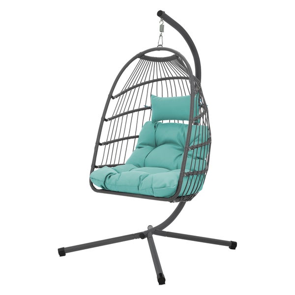 ECD Germany Hängesessel mit Gestell und Kissen + Deckenhalterung, Türkisgrün, Rattan-Optik, Stahl, höhenverstellbar & faltbar, Indoor/Outdoor, Hängestuhl Hängekorb Hängeschaukel Hängesitz, für Garten