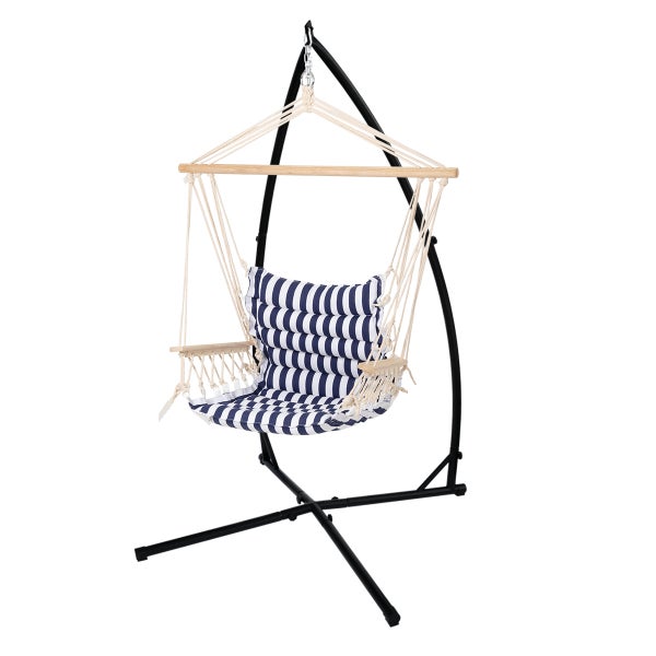 ECD Germany Hängestuhlgestell Schwarz 208cm mit Hängesessel Blau-Weiß Hängestuhl mit Armlehnen Hängeschaukel Baumwolle/Holz bis 120kg, Freistehendes Hängesesselgestell Metall Gestell Hängesitz Ständer