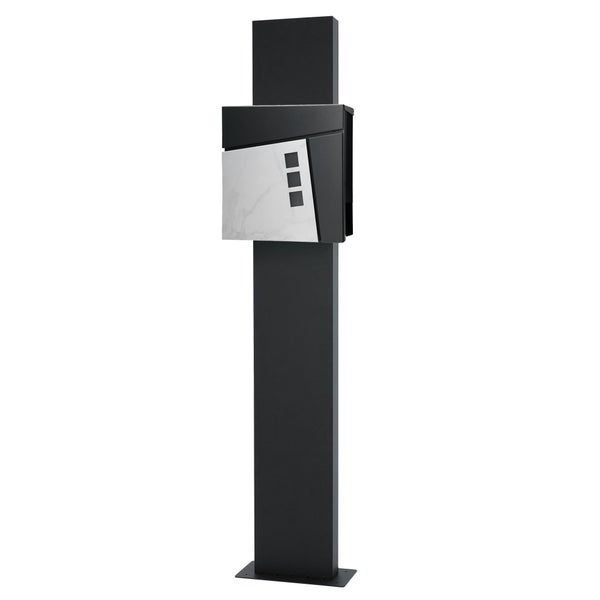 Der Briefkasten besticht nicht nur mit seinen Funktionen, sondern auch mit seinem einmaligen Aussehen. Der Korpus wurde in edlem Anthrazit pulverbeschichtet und die Front wurde in einer Marmoroptik designt. Der Briefkasten besteht aus verzinkter pulverbeschichtetem Stahl und ist wetterfest.