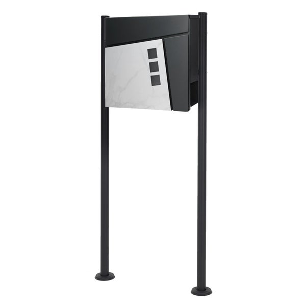 Der Briefkasten besticht nicht nur mit seinen Funktionen, sondern auch mit seinem einmaligen Aussehen. Der Korpus wurde in edlem Anthrazit pulverbeschichtet und die Front wurde in einer Marmoroptik designt. Der Briefkasten besteht aus verzinkter pulverbeschichtetem Stahl und ist wetterfest.