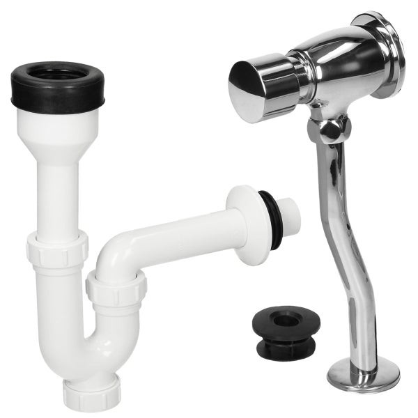 - BeschreibungLieferumfang:1x Druckspüler1x Anschluss exzentrisch1x Lippendichtung1x Rosette1x Ablauf waagerechtTechnische Daten Druckspüler:Material: verchromter Korpus aus Kupferlegierung mit Druckverschluss aus MessingFarbe: ChromAnschlüsse: G1/2"Empfohlener Wasserdruck: 0,1 bis 0,4 MPaMaximale Wassertemperatur: 25 ° CDurchfluss bei 0,3 MPa: ca. 5 l/minAuslaufzeit bei 0,3 MPa: ca. 7 SekundenZum Laufen benötigte Kraft: ca. 14 NSpülzeit: 6-9 SekundenMontageöffnung: DN15/20 mmRohrlänge: Ca. 15 cmEigenschaften:Druckspüler für Urinale zur AufputzmontageSelbstschließende, zeitgesteuerte ArmaturKomplett mit MontagezubehörGenormter Wandanschluss mit ½“ Außengewinde (Wasseranschluss).Inklusive Verbindungsrohr 14,7 cm lang, Wandrosette, Rosette für Urinal und Dichtung am UrinalWasserverbrauch: ca. 1,5 Liter bei 6 Sekunden SchließzeitTechnische Daten Siphon:Farbe: WeißMaterial: Kunststoff PPFür Urinal: DN Ø ca. 32 mmMit Wandrosette: Ø ca. 67,5 mmEigenschaften:Anschluss für Urinal- oder Ausgussbecken mit Ø 50 mm LippendichtungWaagerechter Abgang mit Ablaufanschluss ca. 32 mmAnpassbares Wandanschlussrohr ca. 16 cm lang