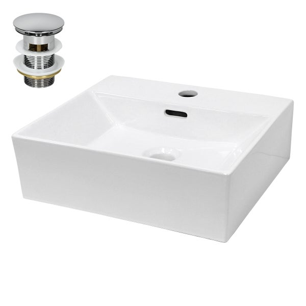 - BeschreibungTechnische DatenWaschbeckenMaterial: KeramikFarbe: WeißMaße (BxTxH): ca. 415 x 360 x 130 mmDurchmesser der Ablaufgarnitur: ca. Ø 45 mmGewicht: ca. 9,7 kgAblaufgarniturMaterial: MessingDurchmesser: Standard Einbaumaß 1 1/4 Zoll (41,2 mm) AußengewindeFarbe: ChromHöhe: ca. 90 mmGewicht: 230 gEigenschaftenWaschbeckenHochwertige KeramikArmatur und Ablauf mit Standard-AnschlussNutzung als Hängewaschbecken mit Wandmontage oder als AufsatzwaschbeckenZwei Löcher für die Wandmontage auf der RückseiteInklusive Überlauf und ArmaturenlochBadkeramik aus einem StückEinfache InstallationAblaufgarniturVerchromtes MessingAblaufgarnitur für Waschbecken mit ÜberlaufInstallation ohne WerkzeugPush-Open-Technologie für komfortable BedienungUniversell für fast alle Waschtische geeignetLieferumfang:1 x Keramik Waschbecken ca. 415 x 360 x 130 mm1 x Ablaufgarnitur für Waschbecken mit ÜberlaufEinhebelmischer und Montagematerial sind nicht in der Lieferung enthalten.