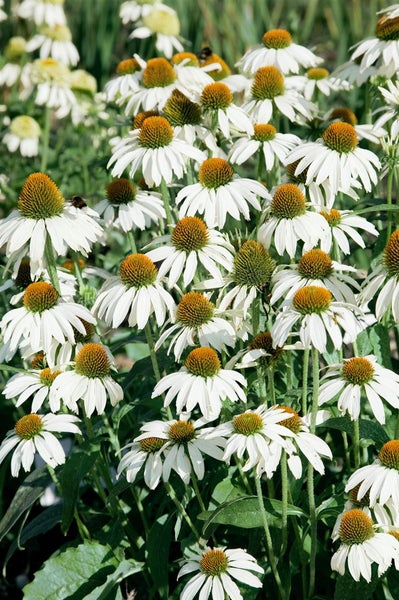 Echinacea purpurea ‘Avalanche’, der weiße Scheinsonnenhut, ist eine elegante Blütenstaude, die mit schneeweißen Zungenblüten und einem grünlich-goldenen, später leicht bernsteinfarbenen Kegel begeistert. Der kompakt-horstige Gartenstauden-Klassiker zeigt von Juli bis September eine reiche, standfeste Blüte und bringt klare, frische Akzente in Beet und Rabatte. Das dunkelgrüne, leicht rau wirkende Laub bildet einen attraktiven Kontrast zu den strahlenden Blüten, während der aufrechte, buschige Wuchs die Pflanze als Solitär ebenso wirkungsvoll macht wie in Gruppenpflanzung. In Präriebeeten, Cottage-Gärten, dem sonnigen Vorgarten oder als Kübelpflanze auf Terrasse und Balkon setzt dieser Blütenstrauch im Staudenformat moderne, langlebige Struktur und überzeugt zudem als hervorragende Schnittblume für die Vase.
