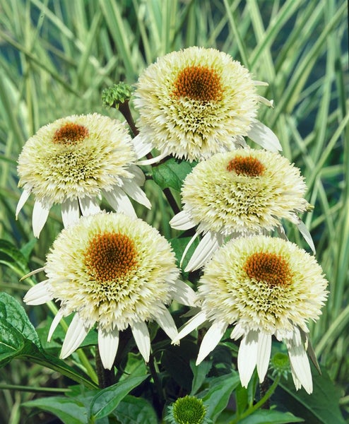 Echinacea purpurea ‘Milkshake’, der Purpur-Sonnenhut ‘Milkshake’, ist eine außergewöhnliche Blütenstaude, die durch ihre cremeweißen, gefüllten Blüten mit pomponartiger Mitte und zart grünlichem Zentrum sofort ins Auge fällt. Von Hochsommer bis in den frühen Herbst präsentiert dieser robuste Prärieklassiker eine reiche, standfeste Blüte, getragen von festen Stielen über einer kompakten, horstbildenden Struktur. Das dunkelgrüne, leicht raue Laub betont den eleganten Auftritt und bildet einen schönen Kontrast zu den hellen Blüten. Mit einer Wuchshöhe von etwa 60 bis 80 cm und einer Breite von 40 bis 50 cm eignet sich ‘Milkshake’ hervorragend für sonnige Beete, Rabatten und den Vorgarten, wirkt als Solitär ebenso wie in Gruppenpflanzung und lässt sich als Kübelpflanze auf Terrasse oder Balkon dekorativ in Szene setzen. In Kombination mit Ziergräsern, Salvia, Perovskia oder Rudbeckia entsteht ein stimmiges, langlebiges Staudenbild mit moderner Prärie-Note. Bevorzugt wird ein sonniger, warmer Standort mit gut durchlässigem, nährstoffreichem, frisch bis mäßig trockenem Boden; Staunässe sollte vermieden werden. Ein Rückschnitt der verblühten Stiele fördert eine anhaltende Blütenwirkung, der bodennahe Rückschnitt erfolgt erst im Spätwinter. Nach der Pflanzung gleichmäßig wässern, später genügt maßvolles Gießen, besonders in längeren Trockenphasen. Als vielseitige Blütenstaude und dekorativer Gartenstrauch im weiteren Sinne überzeugt Echinacea purpurea ‘Milkshake’ zudem als langlebige Schnittblume in der Vase und setzt stilvolle Akzente in naturnahen Staudenbeeten, modernen Zierpflanzungen und pflegeleichten Kombinationen.
