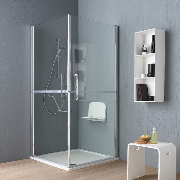 Eckduschkabine 90x90 cm mit einer Höhe von 190cm, perfekt für diejenigen, die Komfort, Sicherheit und einen zeitgenössischen Stil suchen. Ideal für ältere Menschen oder Menschen mit Mobilitätseinschränkungen, dank seiner praktischen doppelflügeligen Türöffnung.