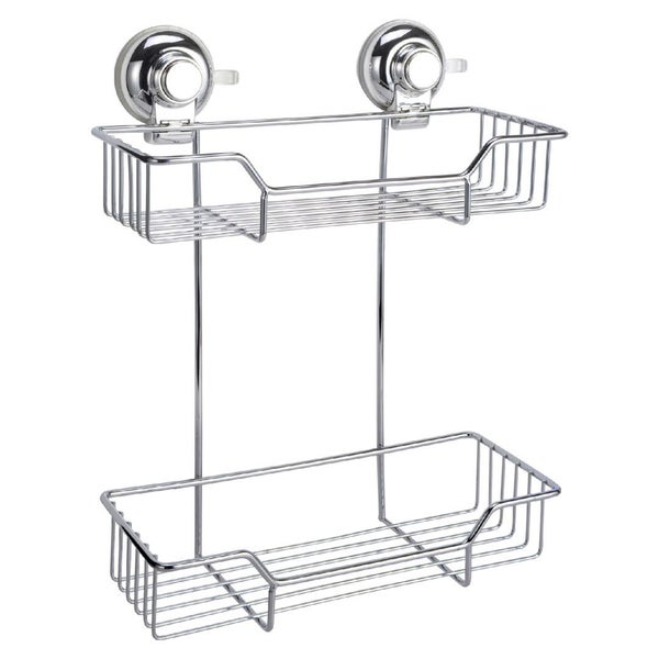 Halterung mit zwei Metalldrahtgittern und Saugnapfbefestigung. Die neuen wandmontierten Badaccessoires der Menta-Kollektion sind mit einem Saugnapf-Befestigungssystem ausgestattet, damit die Wände und Verkleidungen des Badezimmers nicht durch Kleber oder Schrauben beschädigt werden.