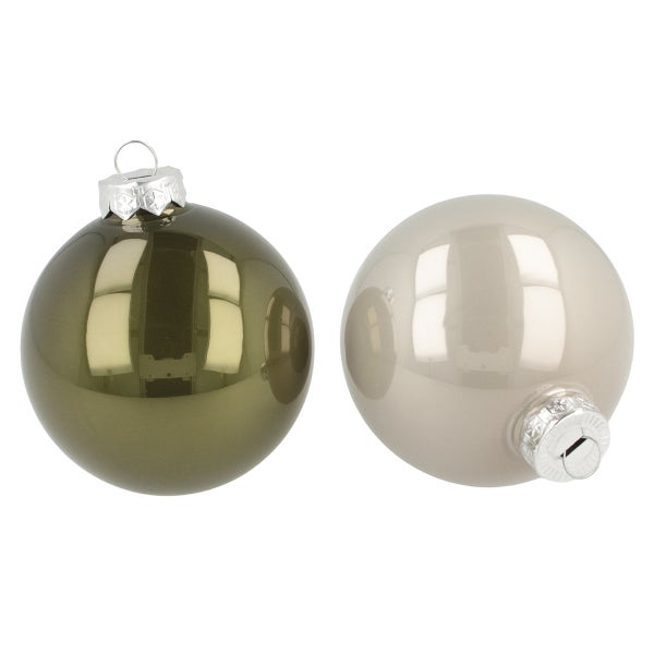 Ein luxuriöser Hauch für Ihr Weihnachtsfest Verleihen Sie Ihrem Heim in der Adventszeit eine erhabene Stimmung mit unserem exquisiten Christbaumschmuck aus Glas. Diese edlen Baumkugeln beeindrucken mit ihrer hohen Qualität und zeitlosen Eleganz. Sie sind mehr als nur Dekoration – sie sind ein Symbol für festliche Freude und gesellige Zusammenkünfte im Kreise Ihrer Liebsten. Vielfältige Dekorationsmöglichkeiten Ob an Ihrer Weihnachtsbaumspitze, innerhalb eines dekorativen Türkranzes oder kombiniert mit einer künstlichen Tannengirlande – diese Glaskugeln werden zum zentralen Blickfang Ihrer weihnachtlichen Inszenierung. Sie lassen sich hervorragend mit weiteren Artikeln von uns kombinieren, um Ihre Dekoration harmonisch abzurunden. Wie wäre es mit einem stilvollen Kerzenhalter oder einem eleganten Holztablett? Pflegeleicht und dauerhaft schön Unsere dekorativen Kugeln zum Hängen begeistern nicht nur durch ihre Schönheit, sondern auch durch ihre Langlebigkeit. Ohne zusätzlichen Pflegeaufwand bleiben sie während der gesamten Feiertage strahlend schön. Denken Sie daran, dass auf unseren Produktbildern gezeigtes Zubehör nicht inbegriffen ist – inspiriert Sie aber vielleicht zu neuen Dekorationsideen. Kreative Möglichkeiten für Ihr Zuhause Erwecken Sie die Magie der Weihnachtszeit und lassen Sie Ihrer Kreativität freien Lauf. Diese Kugeln ergänzen den klassischen Baumschmuck und harmonieren perfekt mit Christbaumanhängern in warmen Tönen. Entdecken Sie das umfangreiche Sortiment an weiterer weihnachtlicher Dekoration von uns und gestalten Sie eine unvergessliche Festatmosphäre. Bitte beachten Sie: Auf Produktbildern gezeigtes Zubehör und Dekorationen sind nicht in der Lieferung inbegriffen. Durchmesser: ca. Ø7,5cm Höhe mit Krone: ca. 8,5cm Farbe: Olivgrün, Silbergrau Material: Glas, Metall Menge: 12 Stück, gemischt Anb.Nr.: 12520 EAN: 4022949125206