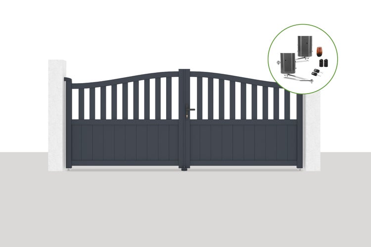 Tauchen Sie ein in Eleganz mit unserem halboffenen Flügeltor 340x140 im einzigartigen „Chapeau de Gendarme“-Stil.