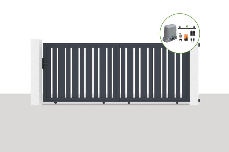 Entdecken Sie unser Aluminium-Schiebetor VEYMONT mit seinem einzigartigen Look dank der Mischung aus unterschiedlich großen Lamellen, die für eine unvergleichliche Originalität sorgen.