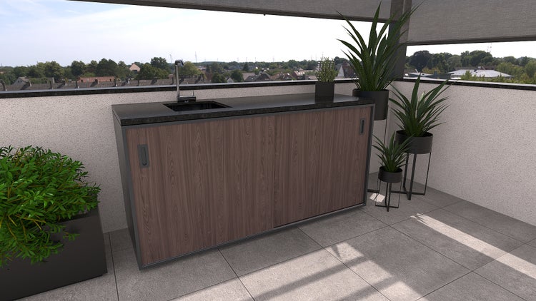 Element mit Spüle, Holzdekor - amerikanische Walnuss, Granit, 1800 x 634 mm, Höhe: 950 mm - Pulverbeschichtete Edelstahl-Outdoorküche Element
