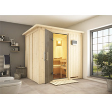 Elementsauna Karibu Sodina inkl. 9 kW Ofen u.ext.Steuerung mit Dachkranz und graphitfarbeneer Ganzglastüre