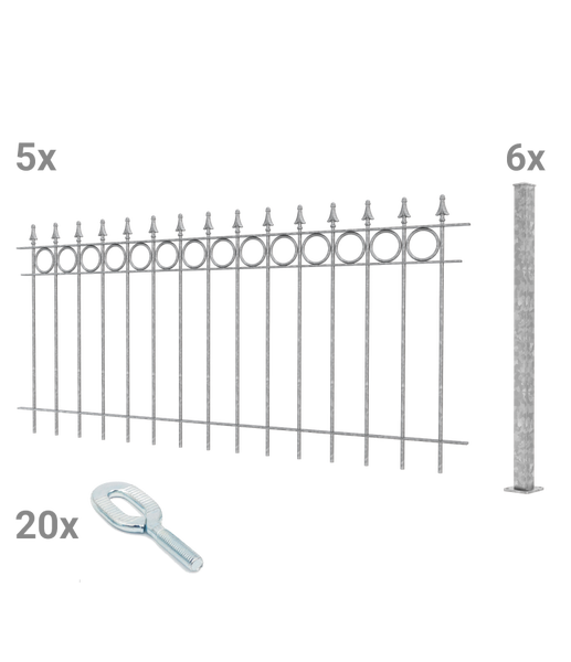 - Im Lieferumfang enthalten5x Zaunelement 192,5 cm breit, 90 cm hoch, feuerverzinkt 6x Zaunpfosten zum Aufschrauben 5 x 5 cm, 100 cm hoch, feuerverzinkt 20x Langlochschrauben zur Befestigung