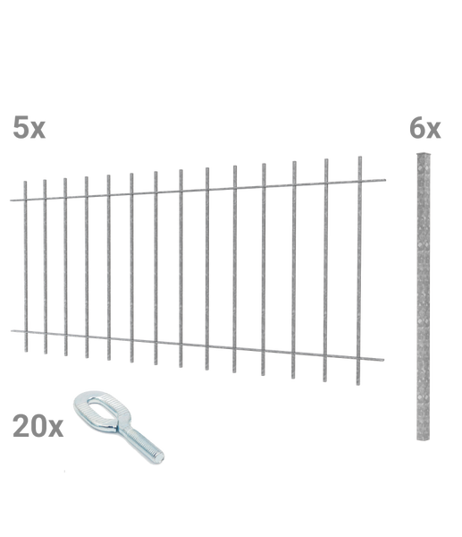 - Im Lieferumfang enthalten5x Zaunelement 192,5 cm breit, 90 cm hoch, feuerverzinkt 6x Zaunpfosten zum Einbetonieren 5 x 5 cm, 150 cm hoch, feuerverzinkt 20x Langlochschrauben zur Befestigung