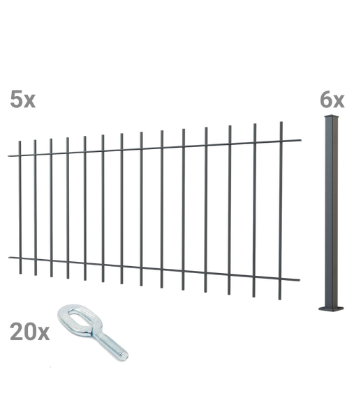 - Im Lieferumfang enthalten5x Zaunelement 192,5 cm breit, 90 cm hoch, pulverbeschichtet anthrazit 6x Zaunpfosten zum Aufschrauben 5 x 5 cm, 100 cm hoch, pulverbeschichtet anthrazit 20x Langlochschrauben zur Befestigung