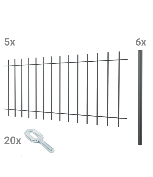 - Im Lieferumfang enthalten5x Zaunelement 192,5 cm breit, 90 cm hoch, pulverbeschichtet anthrazit 6x Zaunpfosten zum Einbetonieren 5 x 5 cm, 150 cm hoch, pulverbeschichtet anthrazit 20x Langlochschrauben zur Befestigung