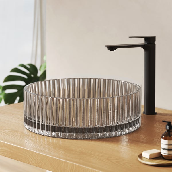 Gehärtetes Bleikristallglas · galvanische Oberfläche · ohne Hahnloch · für hohe Waschtischarmaturen geeignet