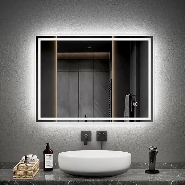 EMKE Badspiegel mit doppelte Beleuchtung 80x60 cm, Lichtspiegel, Kaltweiß, Touch-Schalter, Anti-Beschlag Wandspiegel