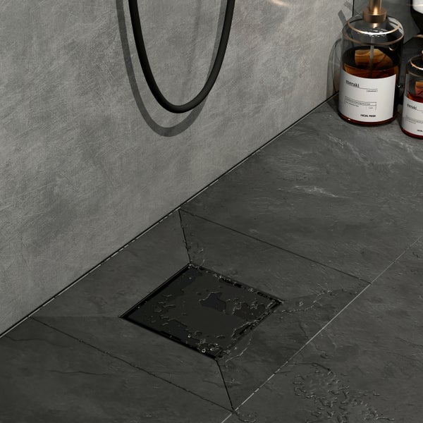 EMKE Duschrinne Quadratischer Bodenablauf Komplettset Edelstahl Duschrinne mit Bodenablaufabdeckung Geruchsstop und Haarsieb Randablauf Schwarz 152,5 mm